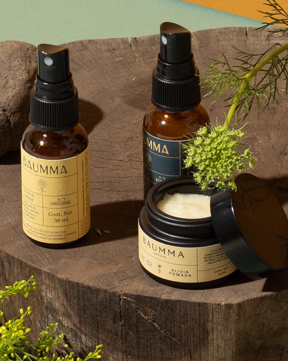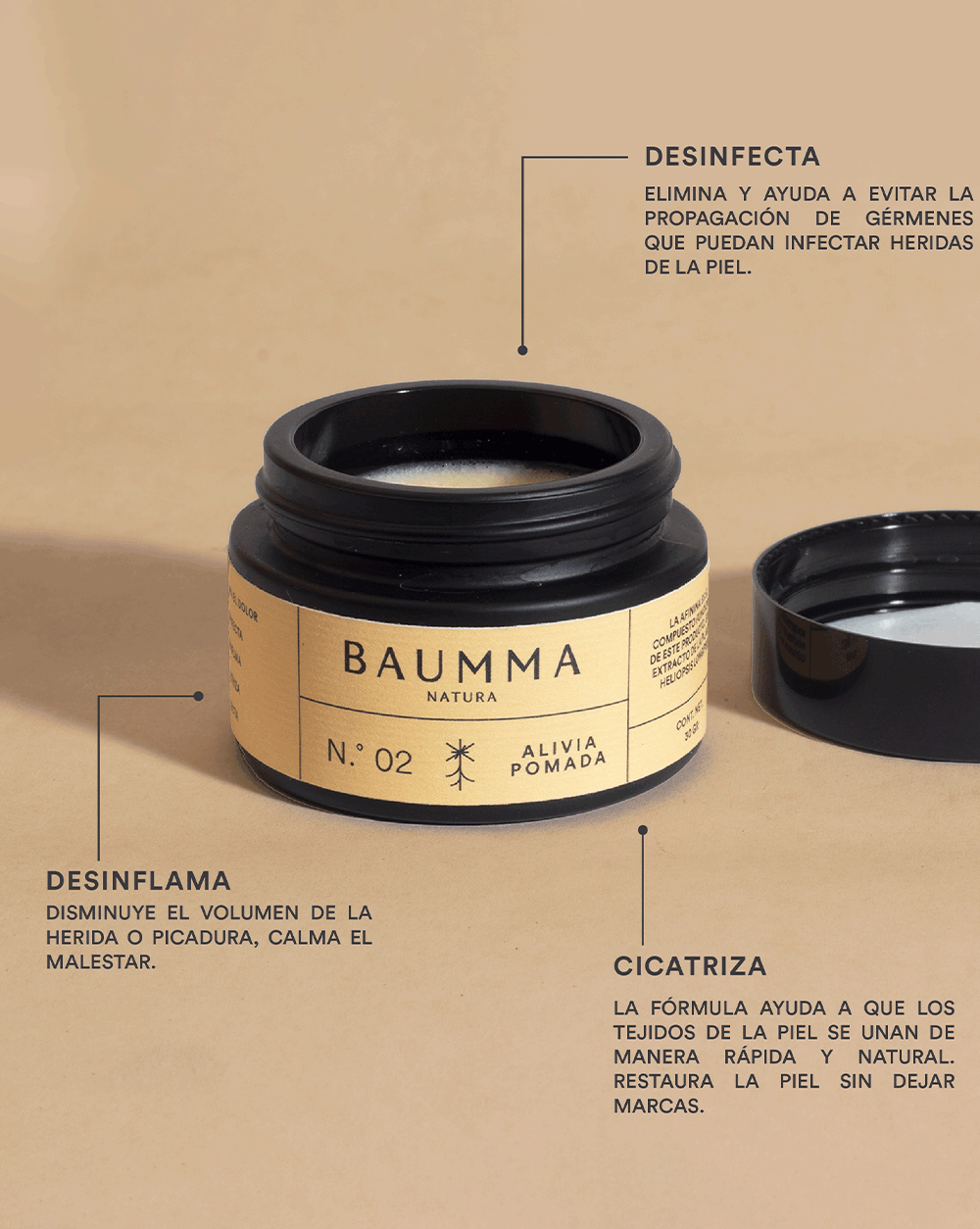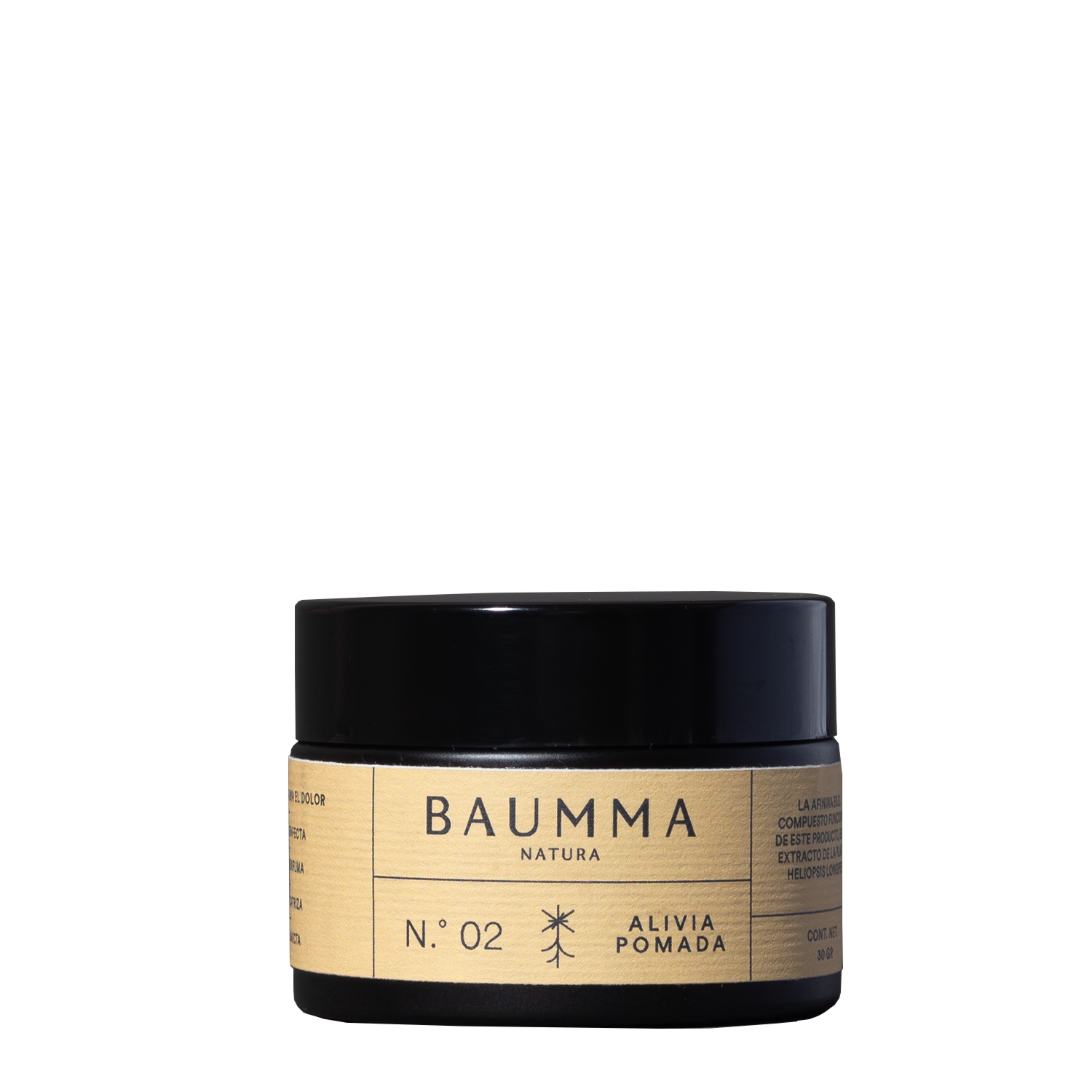 Alivia Pomada es el segundo producto de Baumma. Al igual que Alivia Spray, gracias a la afinina de la raíz, comparten los mismos beneficios. Lo que distingue la pomada, es que su porcentaje de afinina es mayor y por su consistencia puede untarse en lugares menos visibles como los pies, o las nalgas de un bebé. Alivia Pomada no es ingerible. Su uso es sólo cutáneo con el fin de focalizar con mayor precisión el área donde se desea aplicar.