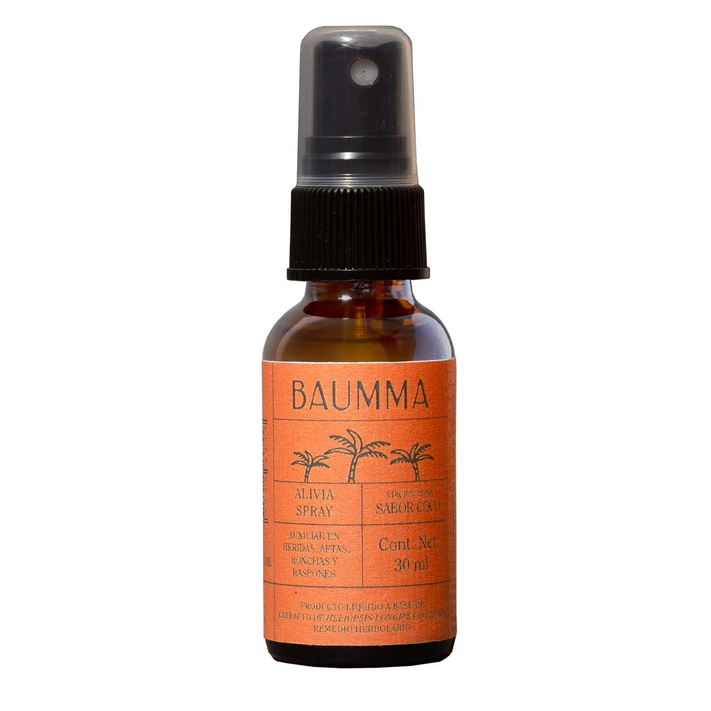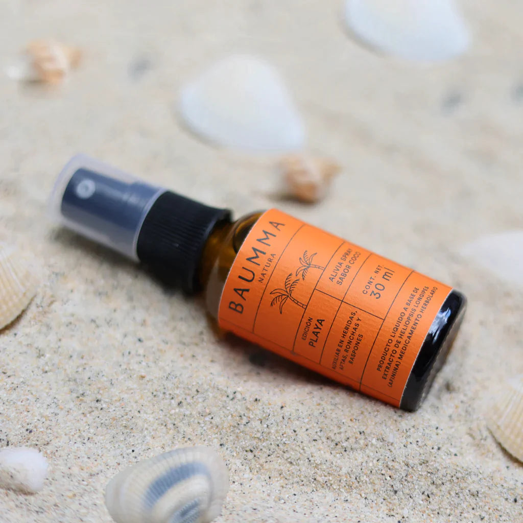 En la playa el sabor a coco no puede faltar. Alivia Spray en su edición playa con esencia de coco es elaborado con el extracto de la raíz de la planta endémica mexicana, Heliopsis longipes. Sirve como bactericida, antiséptico, anestésico y es auxiliar en heridas tanto para la piel como para la boca y la garganta. También es un depresor del sistema nervioso y funciona como anestésico para quitar el dolor. Alivia, cura y cicatriza heridas o infecciones.